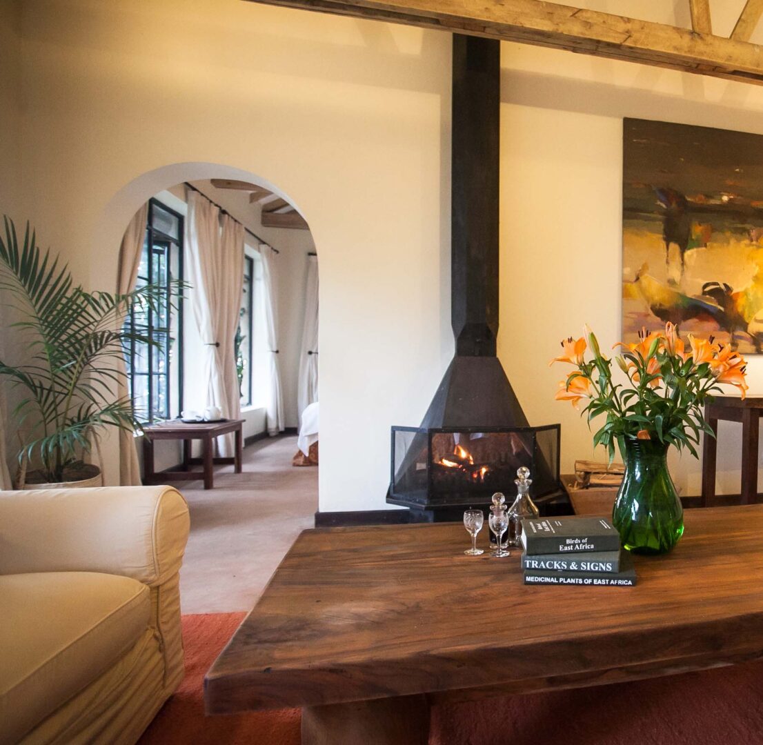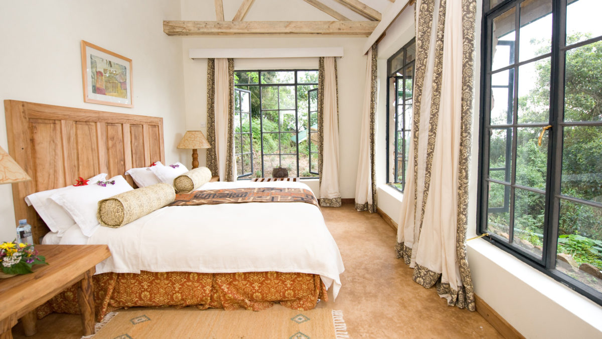 Guests at Clouds stay in their own cottage. Built of local volcanic stone, every cottage has a large sitting room with fireplace, vast overstuffed armchairs, and hand-woven carpets. Each individual cottage features the work of one of Uganda’s most respected artists.