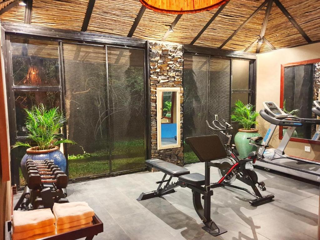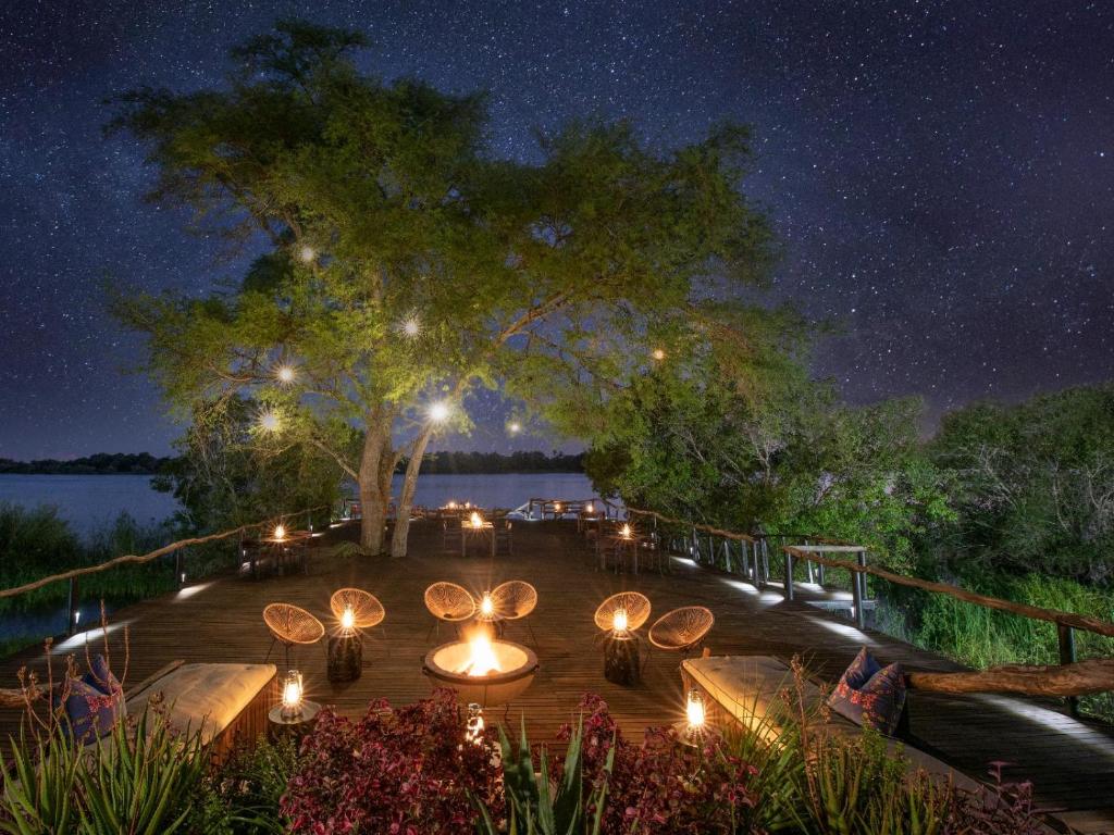 Mukwa Lodge is a luxury retreat set along a tranquil stretch of the Zambezi River near Livingstone. The lodge offers spacious suites and an island villa, each with a private plunge pool, outdoor shower, and expansive deck overlooking the water. Facilities include a riverside dining area with open fireplaces, a heated lap pool, a bar and lounge, and a small spa tucked into the gardens. The setting provides uninterrupted river views and frequent sightings of elephants and other wildlife along the opposite bank.