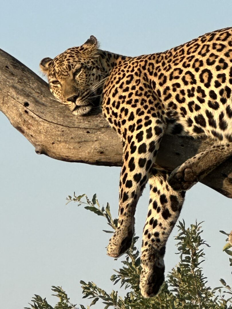 “Thronybush Lodge at Kruger National Park in South Africa. We found a leopard cub alone in the bush, our guide said that meant mom was out hunting for food. Our guide explained that Leopard moms do the hunting leaving their cubs alone. The tracker followed the foot prints thru the bush to find mom perched in a tree looking for prey. Picture was obtained with the vehicle at the base of the tree using a 35 mm Cannon camera with Zoom lens (75-300mm). We also saw a pride of 18 lions, giraffes, zebras, rhinoceros, elephants, hippos, hyenas, and wild dogs. We visited Cape Town before safari and Victoria Falls in Zimbabwe after safari.”