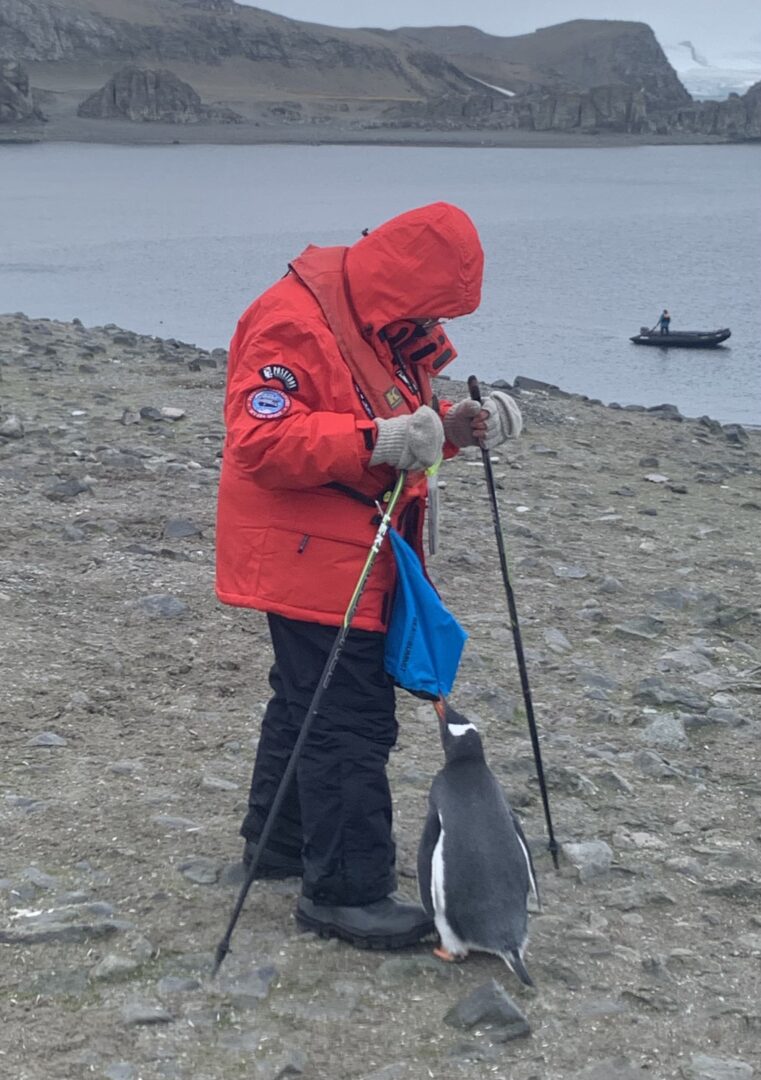 “Shortly after surviving the Drake Passage and arriving in Antarctica, we crossed below the Antarctic Circle and entered the iceberg strewn Isacke Passage. With the flesh and blood Greg Mortimer, himself, as our zodiac driver, we were ringing in the New Year cruising around the ice near Detaille Island when we encountered this ridiculously surreal iceberg, complete with bridges, windows, spirals, and icicles in varying shades of blue. Greg drove us around to get a better look at the bridge when we spotted a lone Adélie penguin on the far side of the berg. Truly a case of being in the right place at the right time. A few minutes later the penguin hit the water in search of its mate. the center piece of an exciting 30+ day adventure that Gabrielle at Vaya put together for us that also included Patagonia and Buenos Aires.”