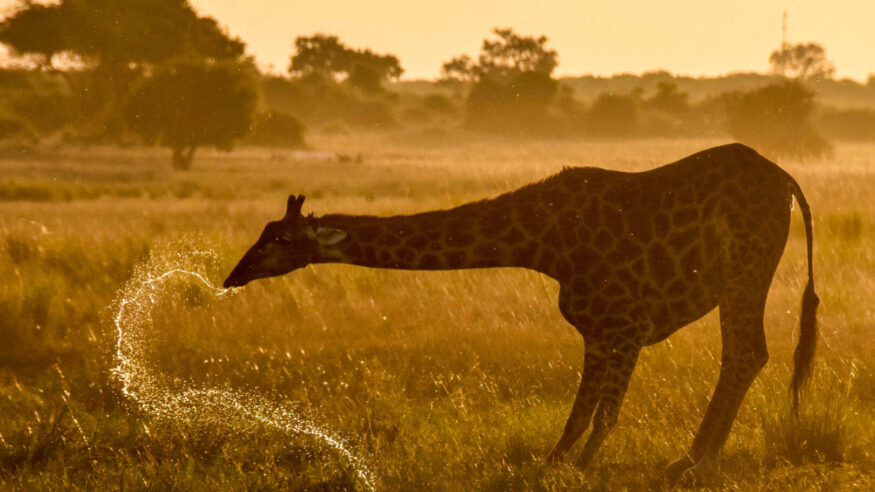 A giraffe flicks up a spray of water as it drinks from a floodplain in Botswana