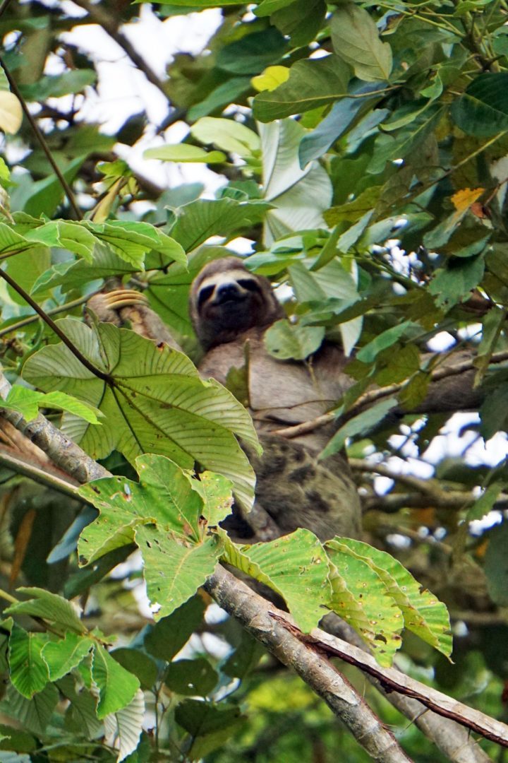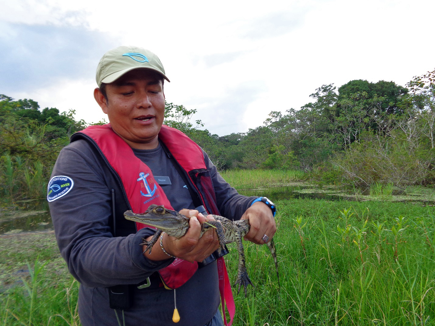 During one of my daily excursions, we were on the skiffs cruising through a small tributary. It was an early morning excursion, and the setting was beautiful: the sun was shining and the temperature was warm and balmy. It was a wonderful way to begin the day searching for wildlife. As we cruised along, we started to come upon floating lily pads. These were not just average lily pads – they were huge. It got to the point where our skiff was surrounded by these huge lily pads. Our skiff slowed to a crawl, then to a stop, and our guide slipped quickly to the front. As he laid on his belly and reached over the side of the skiff into the water, I exchanged puzzled glances with the other passengers. A moment later, to everyone’s surprise, he pulled his arm out of the water and was holding a young caiman. It was an impressive maneuver! Our guide held the caiman gently while explaining a bit about their history, behavior, and how they coexist with the native people in the jungle. This moment became one of the highlights of my trip.