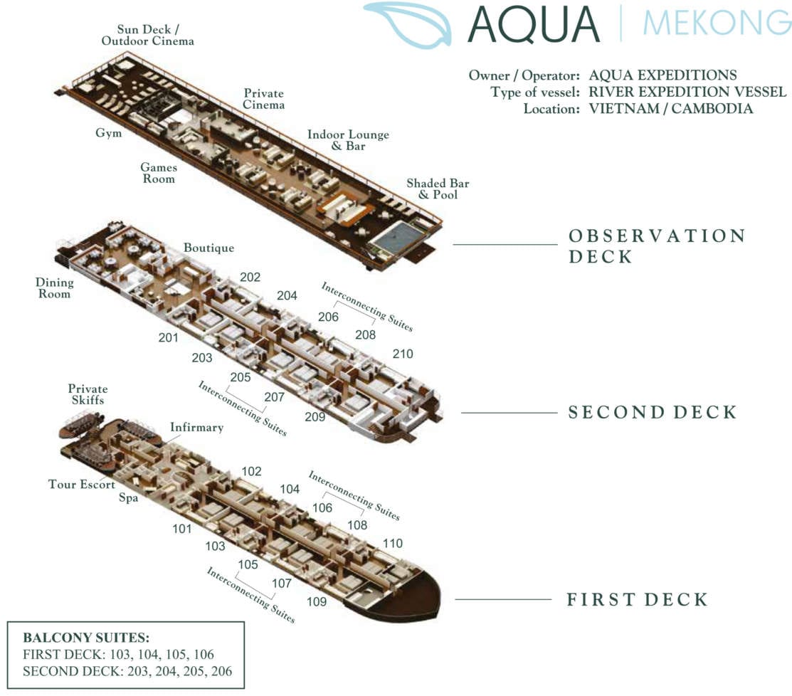 Aqua Mekong has 20 spacious and luxuriously-appointed, 322 square feet (30 sq m) Design Suites, plus two 644 sq ft (60 sq m) interconnecting suites.