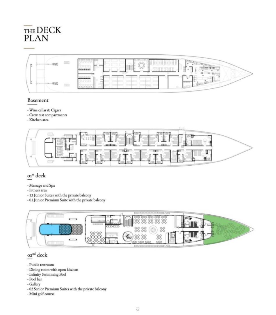 Launch: 2022 Ports of Embarkation: Halong – Lan Ha bay Length: 85m Beam: 14.2m AC: Central air-conditioning throughout Internet: Complimentary Capacity: 99 passengers