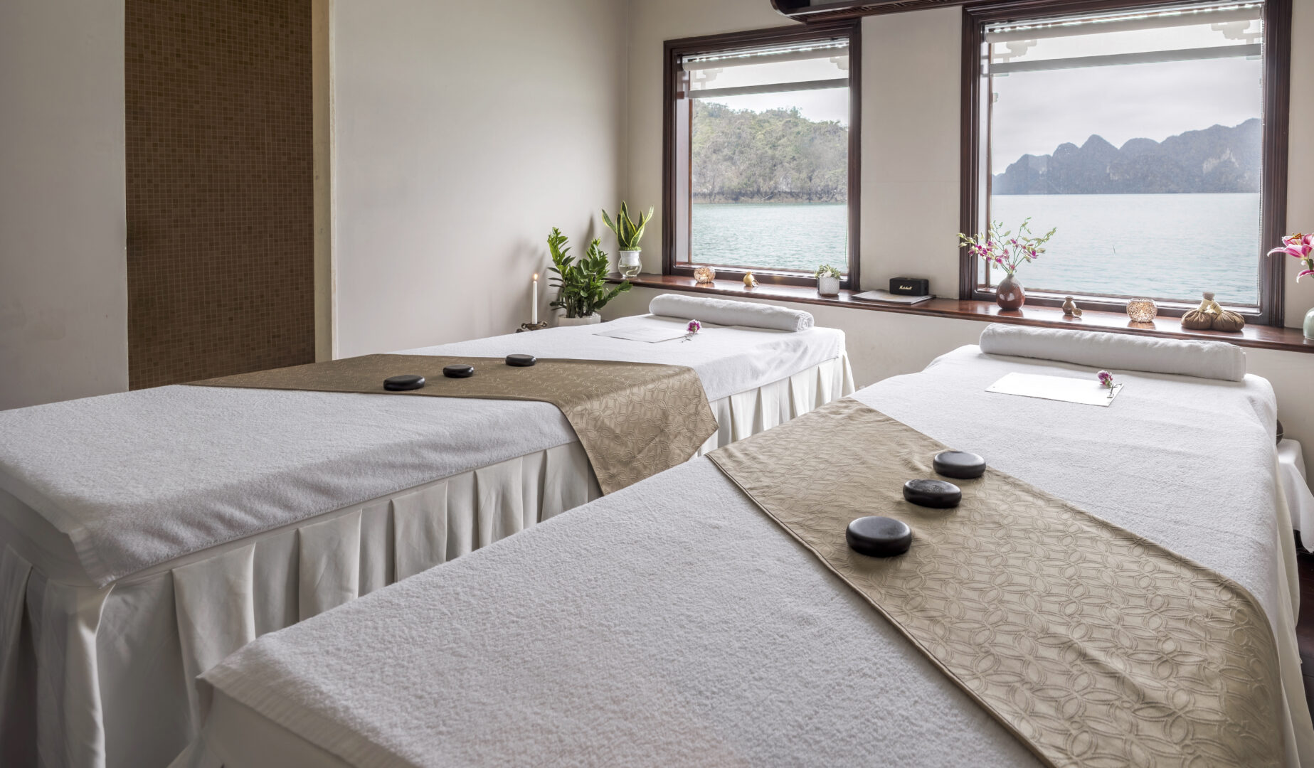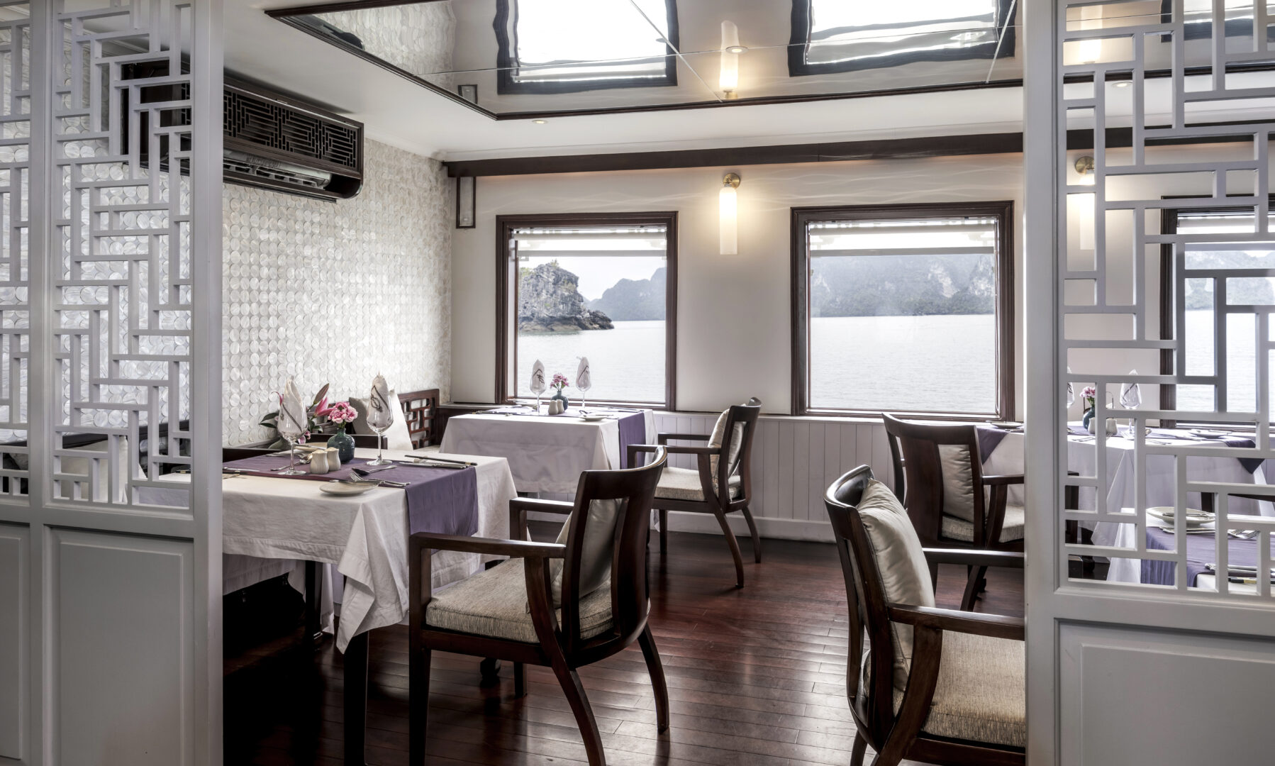 The Violet features just 6 total suites, making for an intimate cruising experience. On the main deck there are 2 Junior Suites. These measure 32sqm and feature on oversized bathroom and private balcony. On the upper deck, there are 4 Imperial Suites at 38sqm. All Imperials Suites are decorated in art-deco style and feature amazing views through the floor to ceiling windows and from each room’s private balcony.