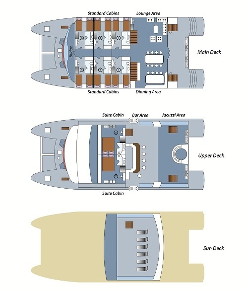• 6 Standard Cabins: 150 sq. ft., located on the Main Deck, twin or matrimonial bed, picture windows