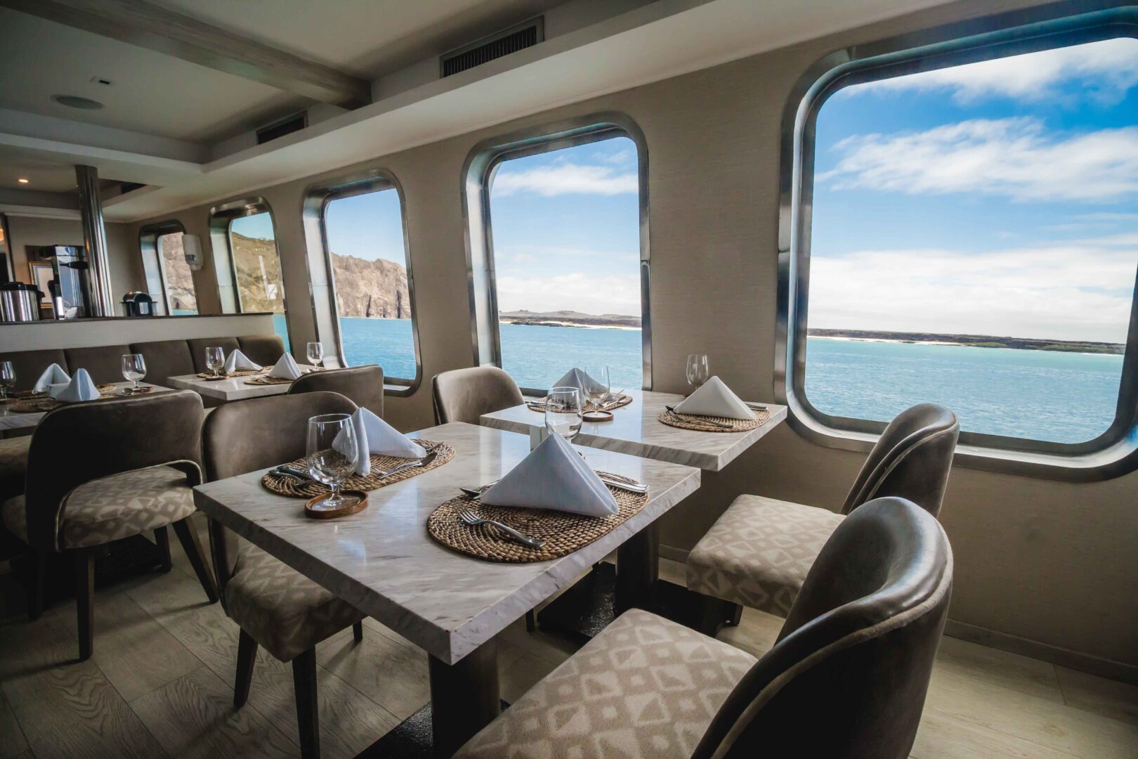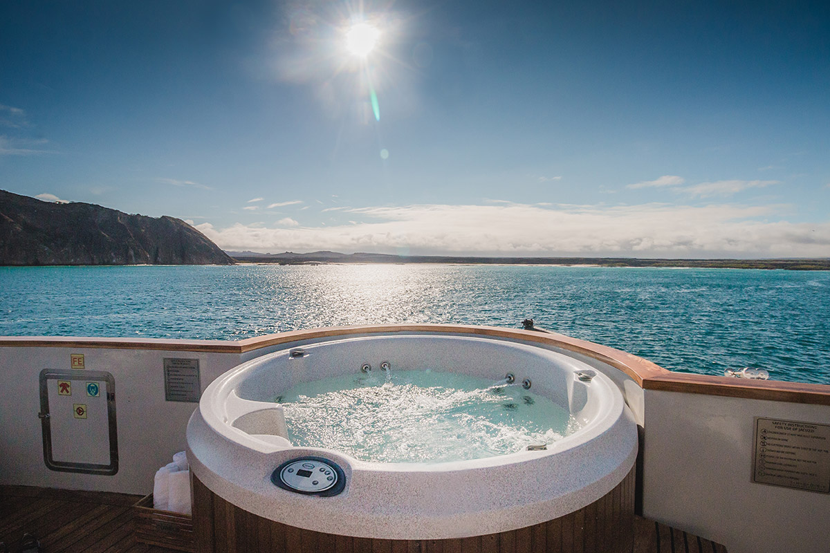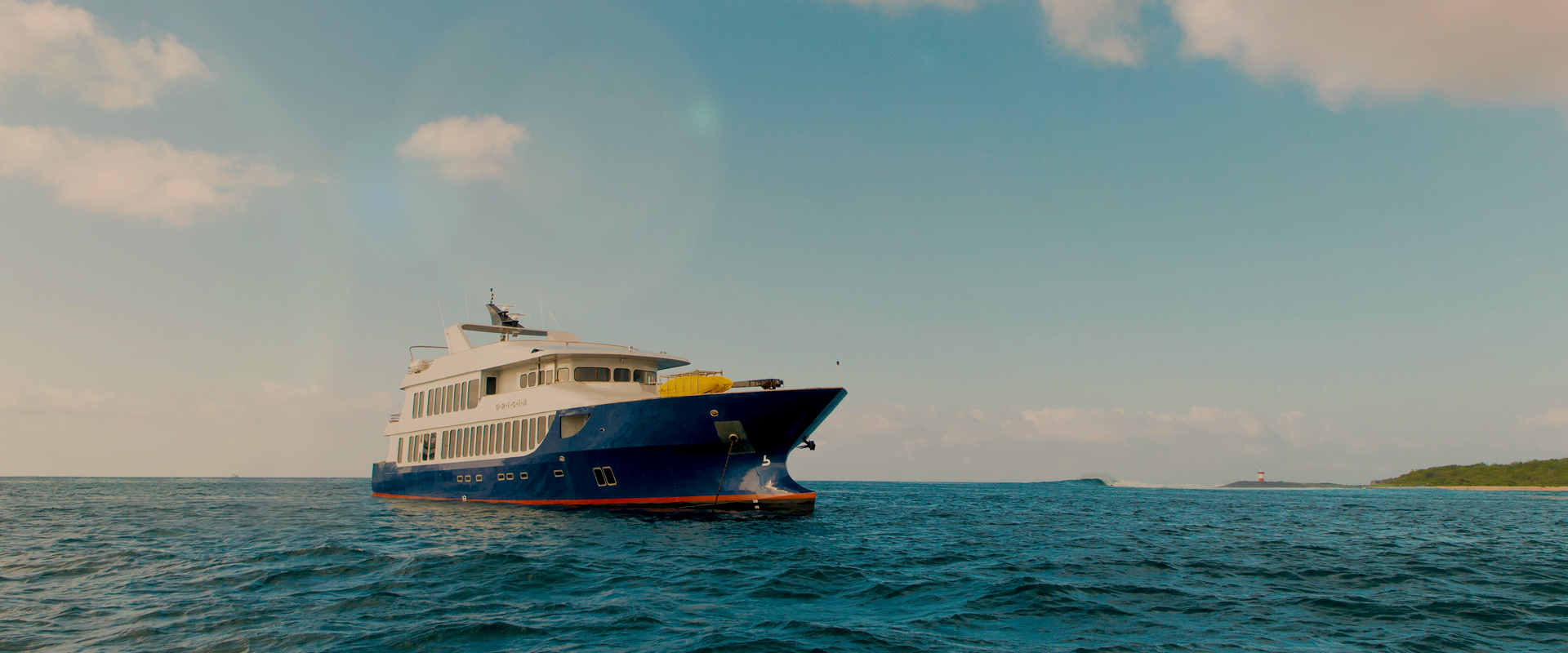 Three of the newer boats in the islands, the Origin, Theory, and Evolve are sister ships designed for a luxurious boutique experience. These 20-passenger Relais & Chateaux ships have 10 cabins with panoramic windows and feature spacious social areas, sun decks and jacuzzis, space for al fresco dining, a fitness center, spa, and a glass-bottom boat. Meals are planned and prepared by trained chefs, there is an onboard concierge for assistance, and the boats have an open bar policy. With two naturalist guides, Origin/Theory/Evolve offer some of the best guide-to-guest ratios in the islands. Excursions include snorkeling, hiking, kayaking, stand-up paddle boarding, and panga rides.