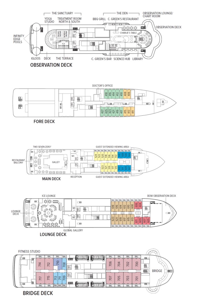 • Category 2 (Fore Deck—Standard cabin with two large windows, Alcove seating, Relax chair, 205 square ft. #410, 412, 414, 416-419, 421-427)