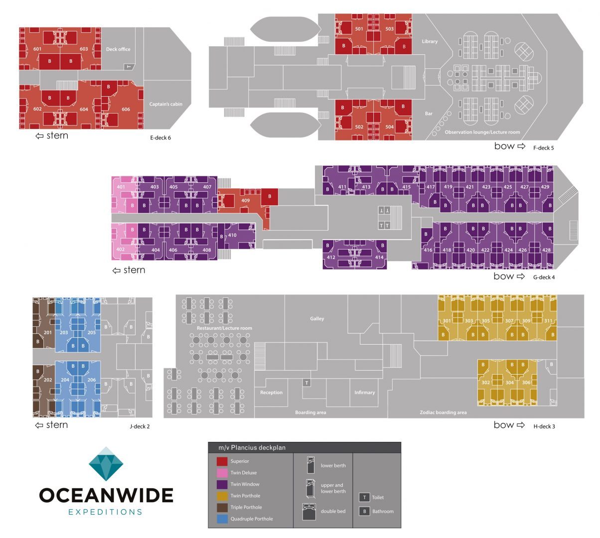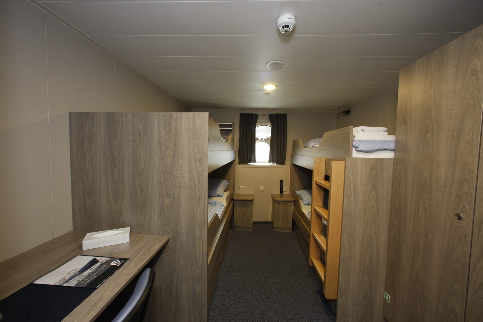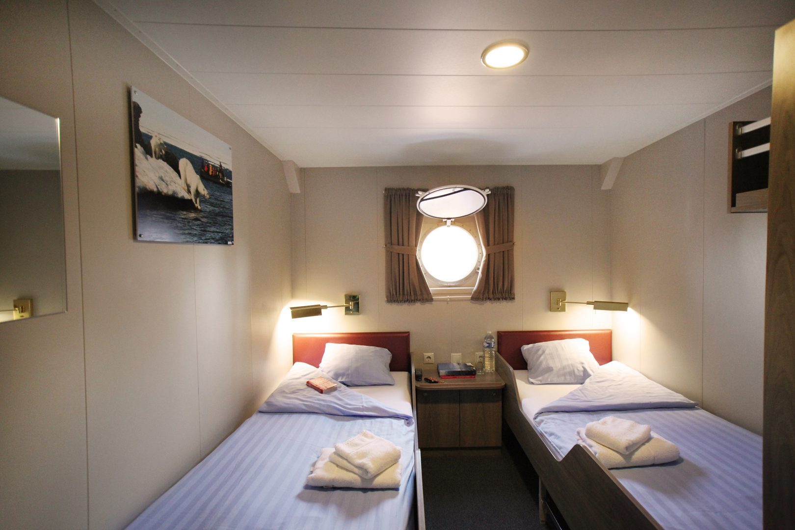 M/v “Plancius” accommodates 116 passengers in 53 passenger cabins, each with a private toilet and shower. This includes 4 quadruple porthole cabins, 2 triple porthole cabins, 9 twin porthole cabins, 26 twin cabins with a window, and 2 twin deluxe cabins (ca. 12.5 square meters) and 10 twin superior cabins (ca. 21 square meters). All cabins offer lower berths (one queen-size bed in the superior cabins and two single beds in the twin cabins) except the 4 quadruple cabins which accommodate 4 people in 2 upper and 2 lower beds, and 2 triple cabins which are set up with 1 bunk bed and 1 lower bed.