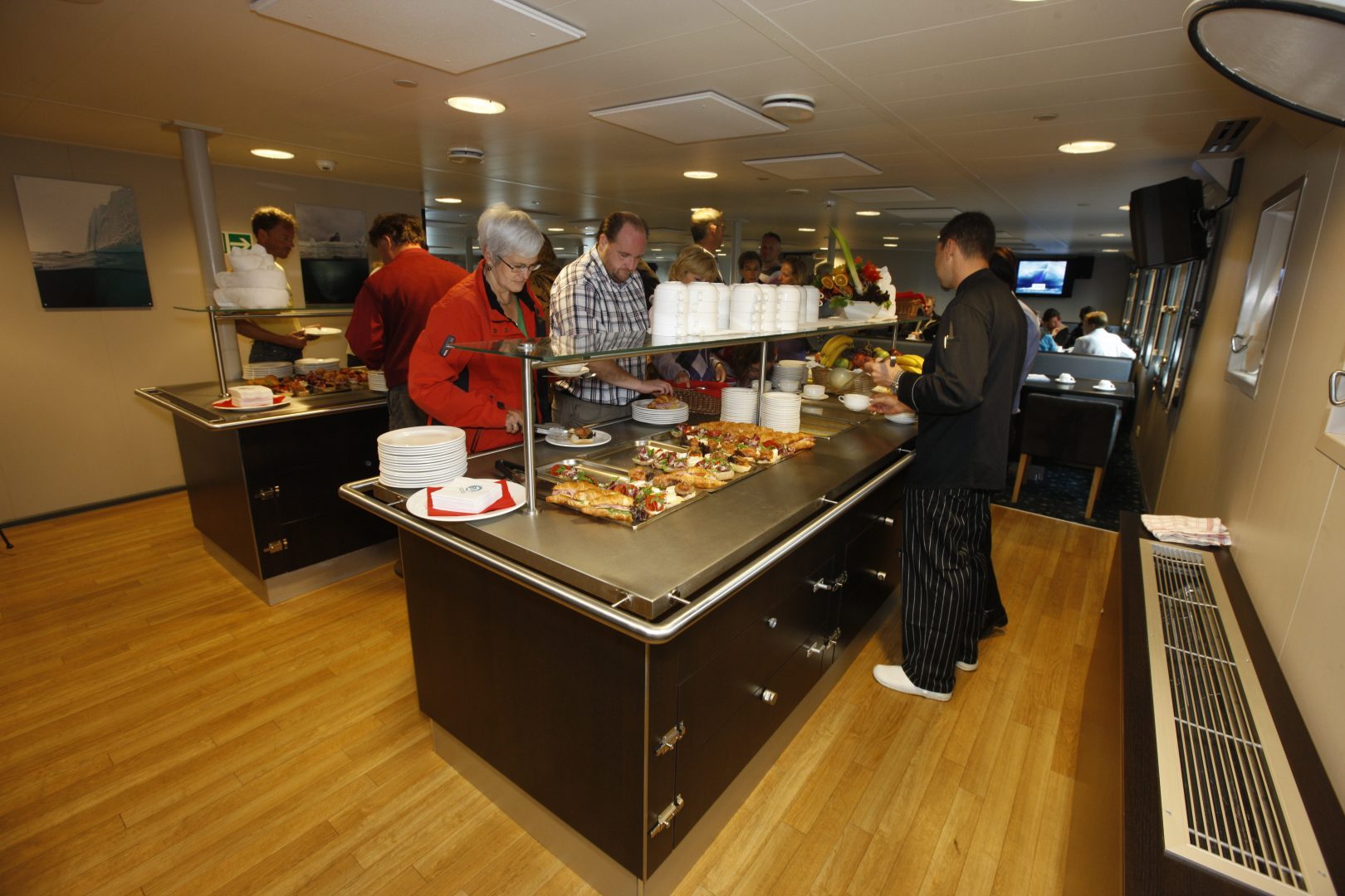 The vessel offers a restaurant/lecture room on Deck 3 and a spacious observation lounge (with bar) on Deck 5 with large windows, offering a full panorama view. The Plancius has large open deck spaces (including full walk-around possibilities on Deck 4) providing excellent opportunities to enjoy the scenery and wildlife in both the Arctic and Antarctica. She is furthermore equipped with 10 Mark V zodiacs, including 40 HP 4-stroke outboard engines and 2 gangways on the starboard side, guaranteeing a swift zodiac operation for excursions.