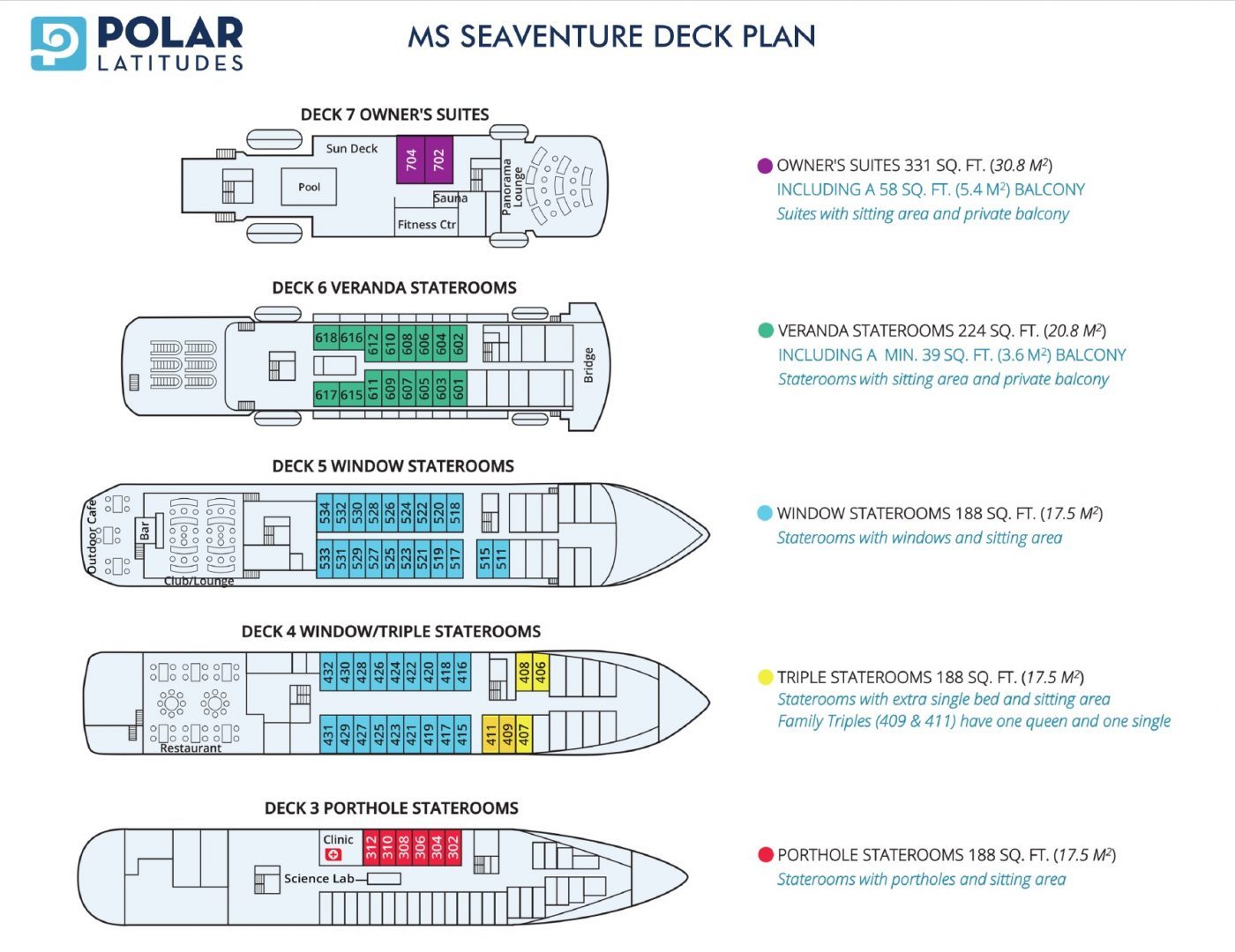 Seaventure is a new vessel launched November 2021. It features a 1-A Super ice class rating which is the highest ice class awarded to passenger vessels. This means that we will be able to explore coves, bays, and channels that other vessels can not. The ship also offers several leisure areas including a sauna, a fitness center, a custom-built citizen science lab, and a heated saltwater pool. There is also ample storage space, which means it can carry more equipment so that guests can participate in activities like kayaking, snowshoeing, and camping. The common areas are large and beautifully appointed, and the ship has two kitchens, one on the Lido deck for al fresco dining when weather permits.