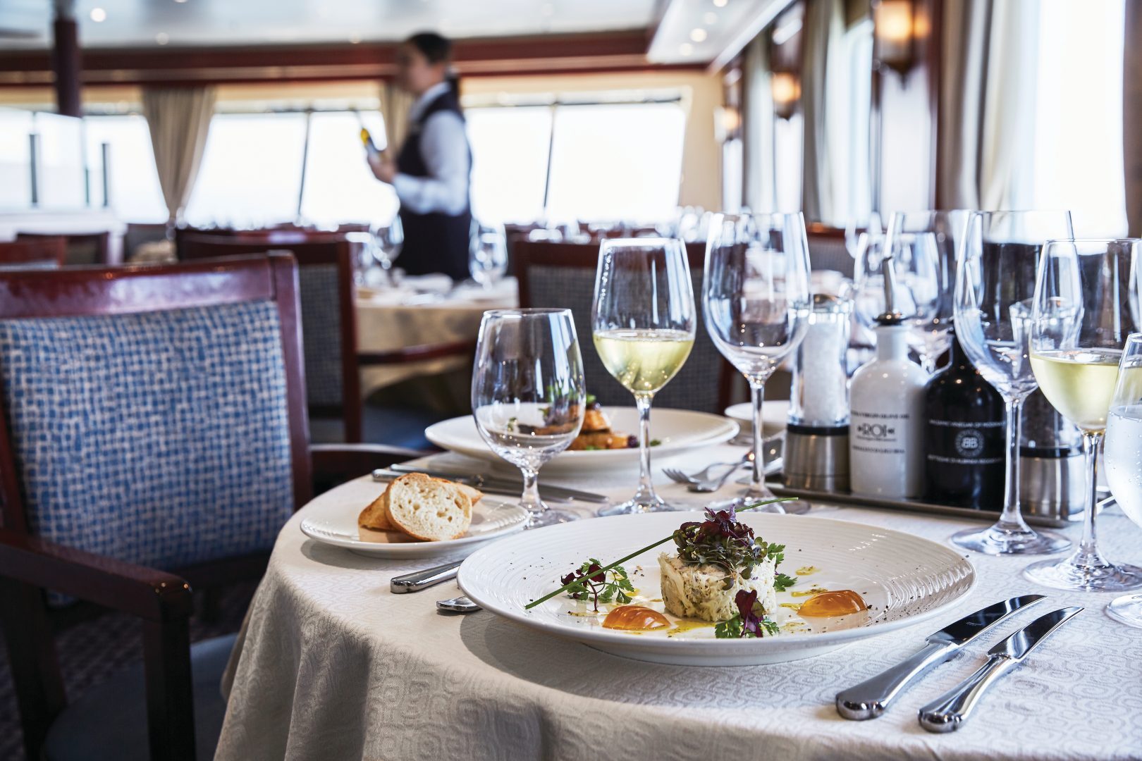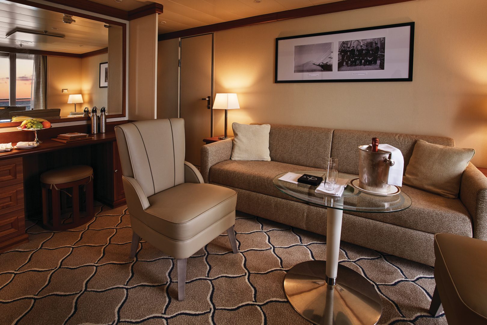 Grand Suite – Expertly designed and exquisitely appointed. Ideal for entertaining friends while you cruise or enjoying a quiet dinner “at home.” (618 sq. ft. including private balcony)