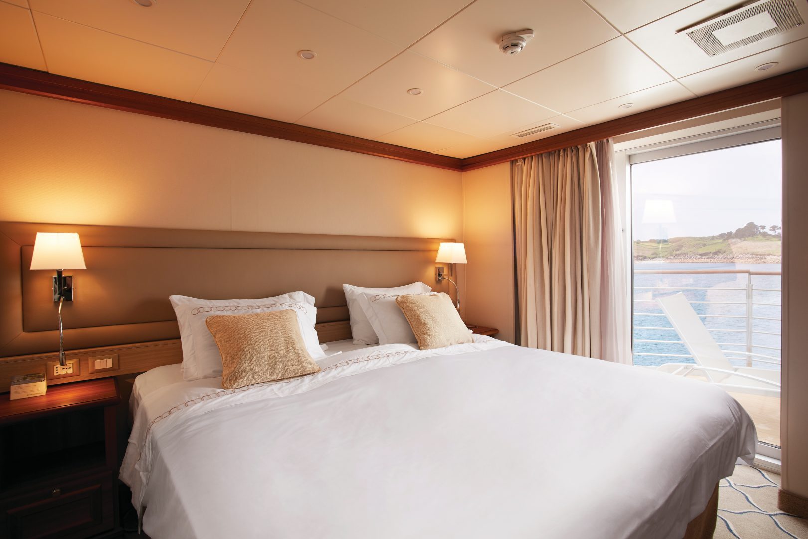 Veranda Suite – A Silversea cruise signature, complete with floor-to-ceiling glass doors that open onto a private balcony. (216 sq. ft. including a French balcony)