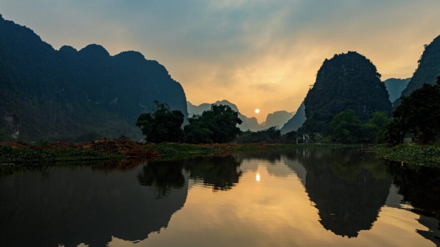 Start your exploration with a bike ride through scenic Van Long, a valley ringed with Ninh Binh’s signature limestone mountains. Then, transfer to the Van Long Nature Reserve for a one hour bamboo boat ride through this stunning scenic wetland, where birds and rice paddies abound.