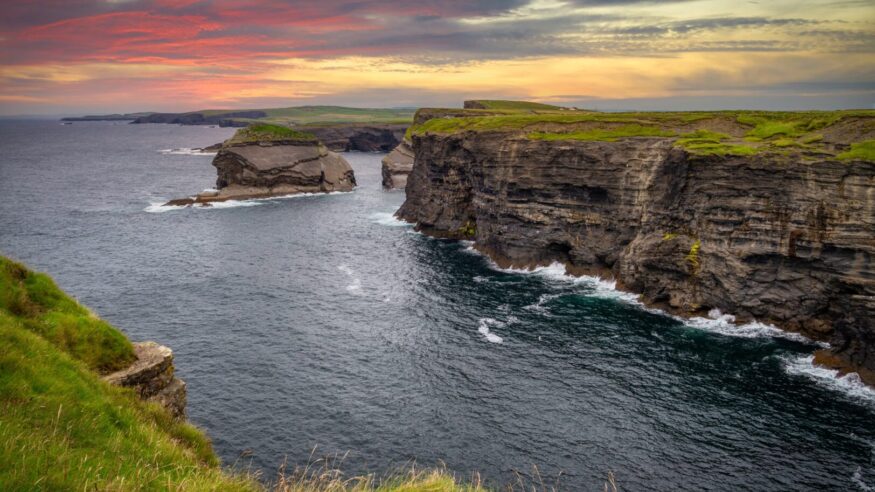 This morning you will set out on a half-day sea kayaking adventure in Liscannor Bay, paddling through clear waters beneath the dramatic cliffs of County Clare. As you glide along the coastline, watch for seals, seabirds, and other marine life, all against the backdrop of the Wild Atlantic Way. In the afternoon, continue to Kilkee for a scenic cliff walk. The two mile trail hugs the edge of the Atlantic, revealing striking rock formations, sweeping ocean views, and the rugged beauty of Clare’s coastline.