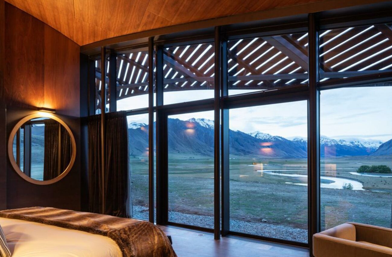 The Lindis is a striking luxury lodge hidden in the remote Ahuriri Valley of New Zealand’s South Island, designed to disappear into its dramatic high-country landscape. Its sweeping, curved roofline mirrors the surrounding hills, while interiors feature natural stone, timber, and glass that frame expansive views of tussock plains and rugged mountains. The lodge offers just a handful of suites, including ultra-secluded glass-walled pods set away from the main building for complete immersion in nature. Guests can enjoy refined dining with produce sourced from the region, fly-fishing in world-renowned streams, guided horse trekking, e-biking, and stargazing under some of the clearest skies in the world. The combination of architectural daring and pristine wilderness makes The Lindis one of New Zealand’s most unique retreats.
